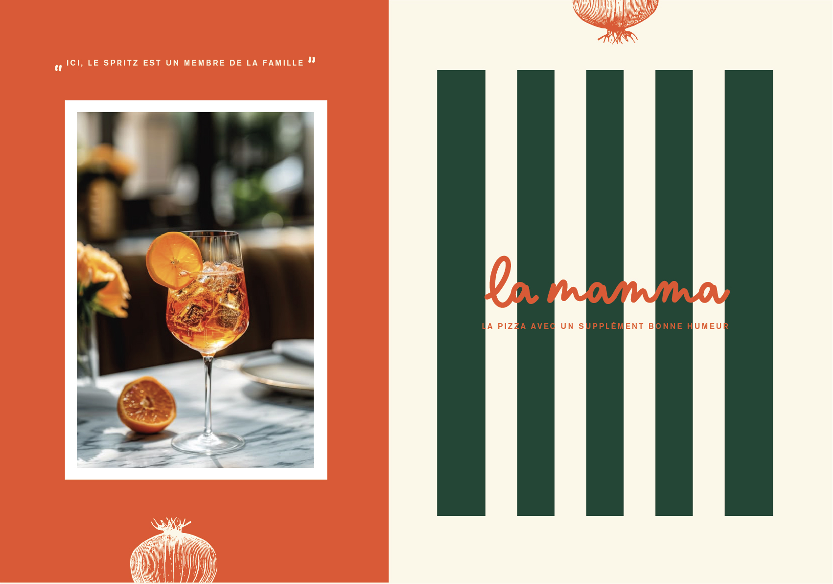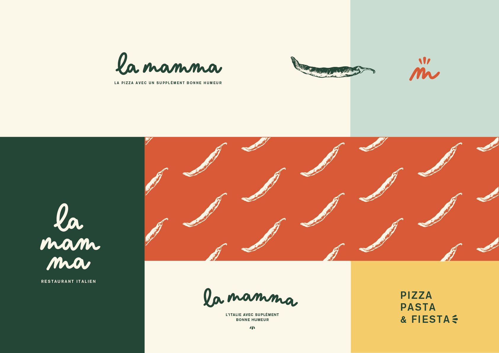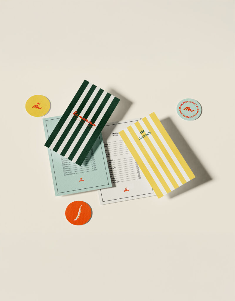 Pour La Mamma, on a imaginé une identité colorée, festive et chaleureuse, loin des codes figés. La palette s’inspire directement de l’univers italien et de la cuisine : rouge tomate, vert basilic, crème, jaune solaire, touches de menthe et de vert. Le logo, à la typographie ronde et manuscrite, renforce cette sensation d’accueil et de générosité.