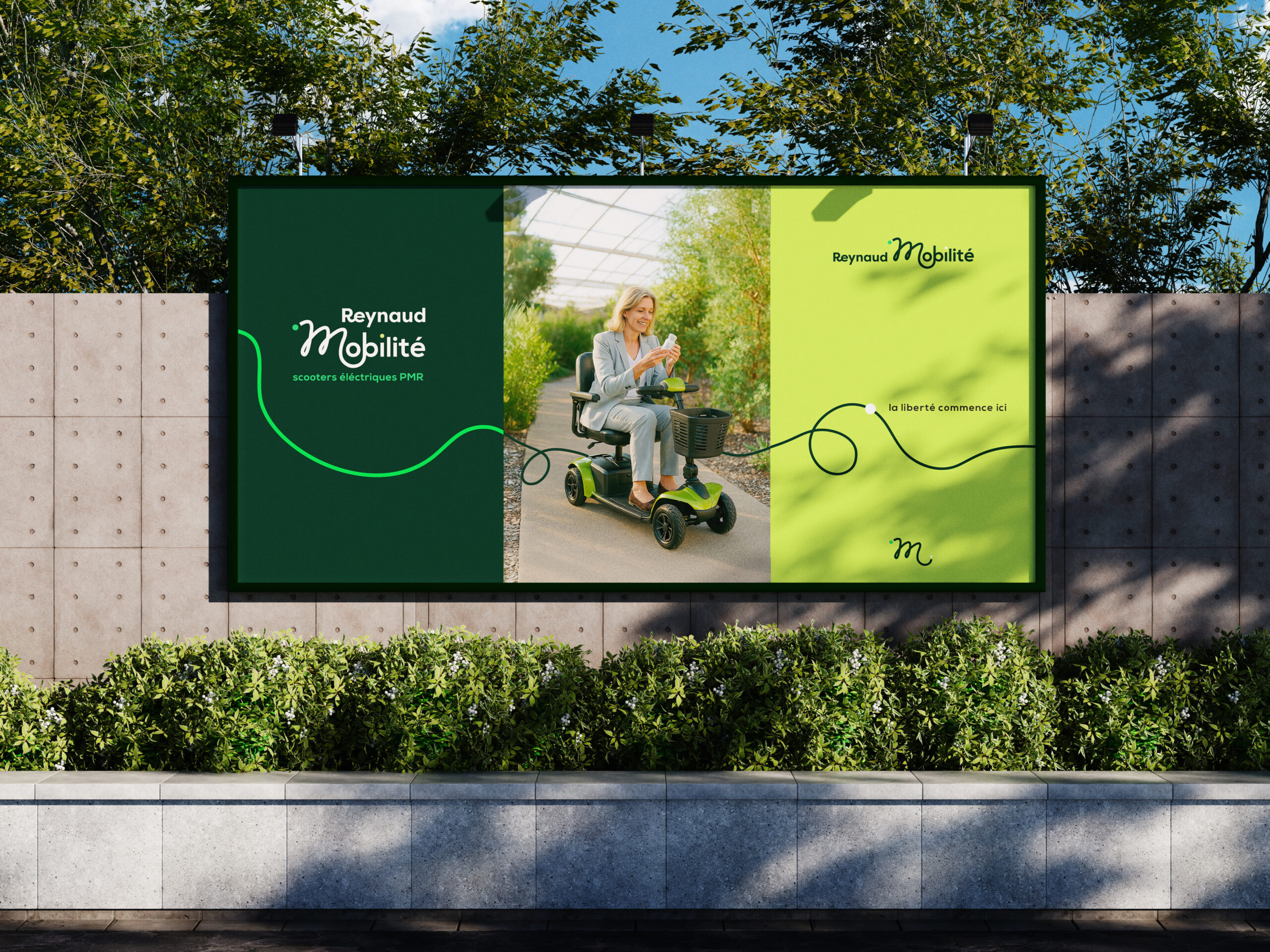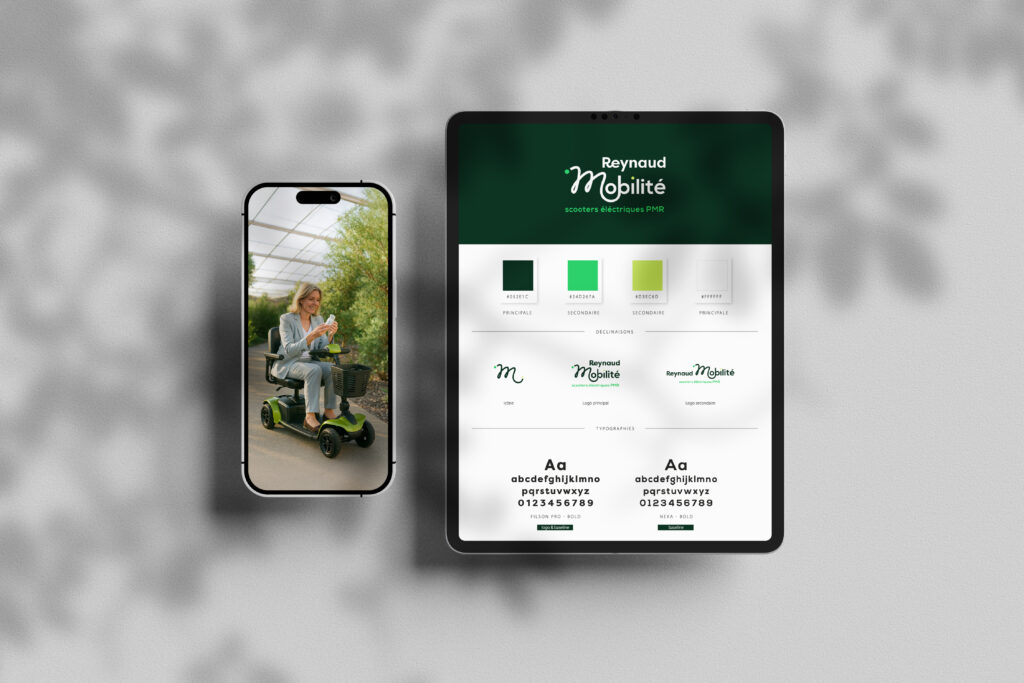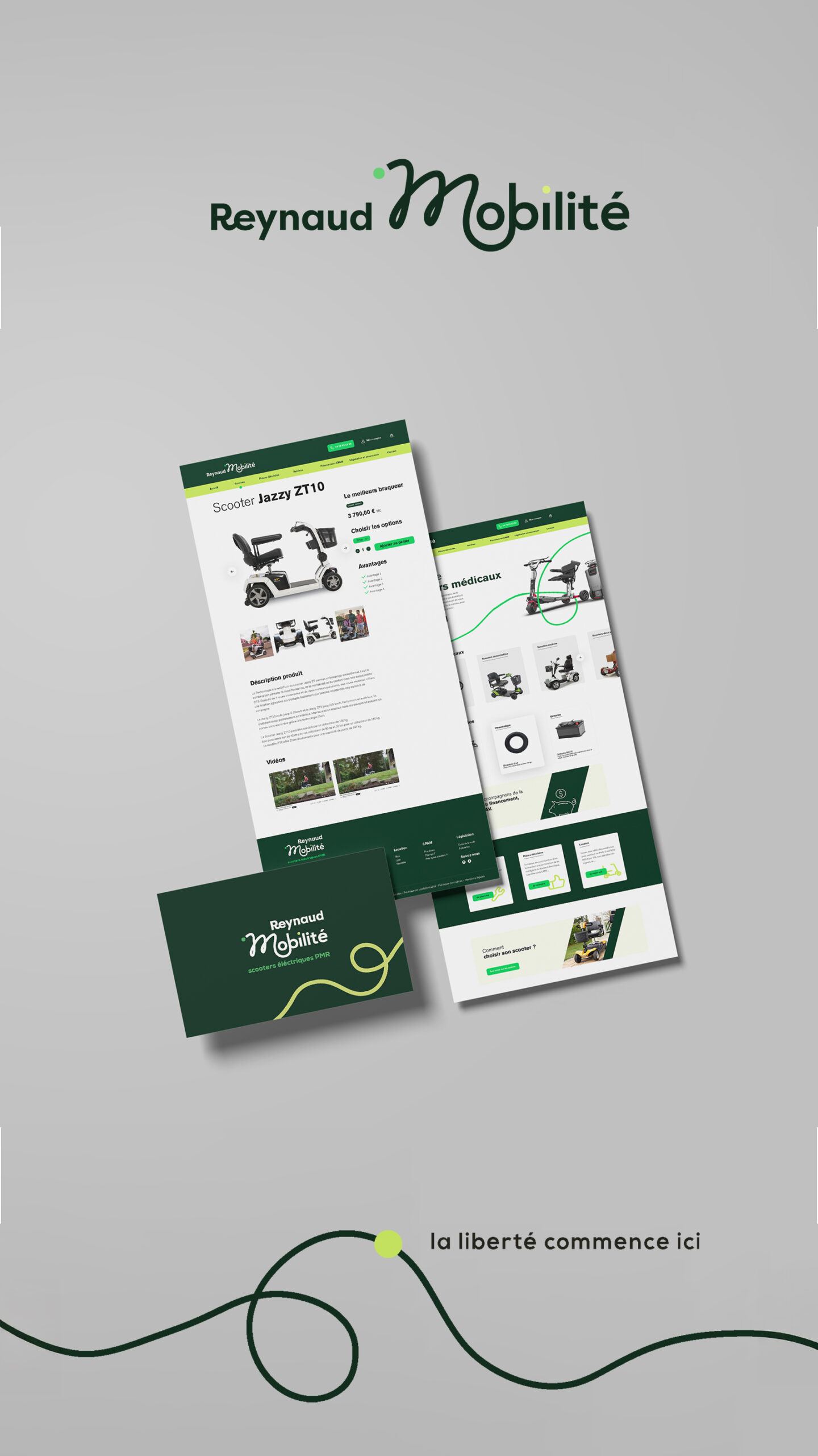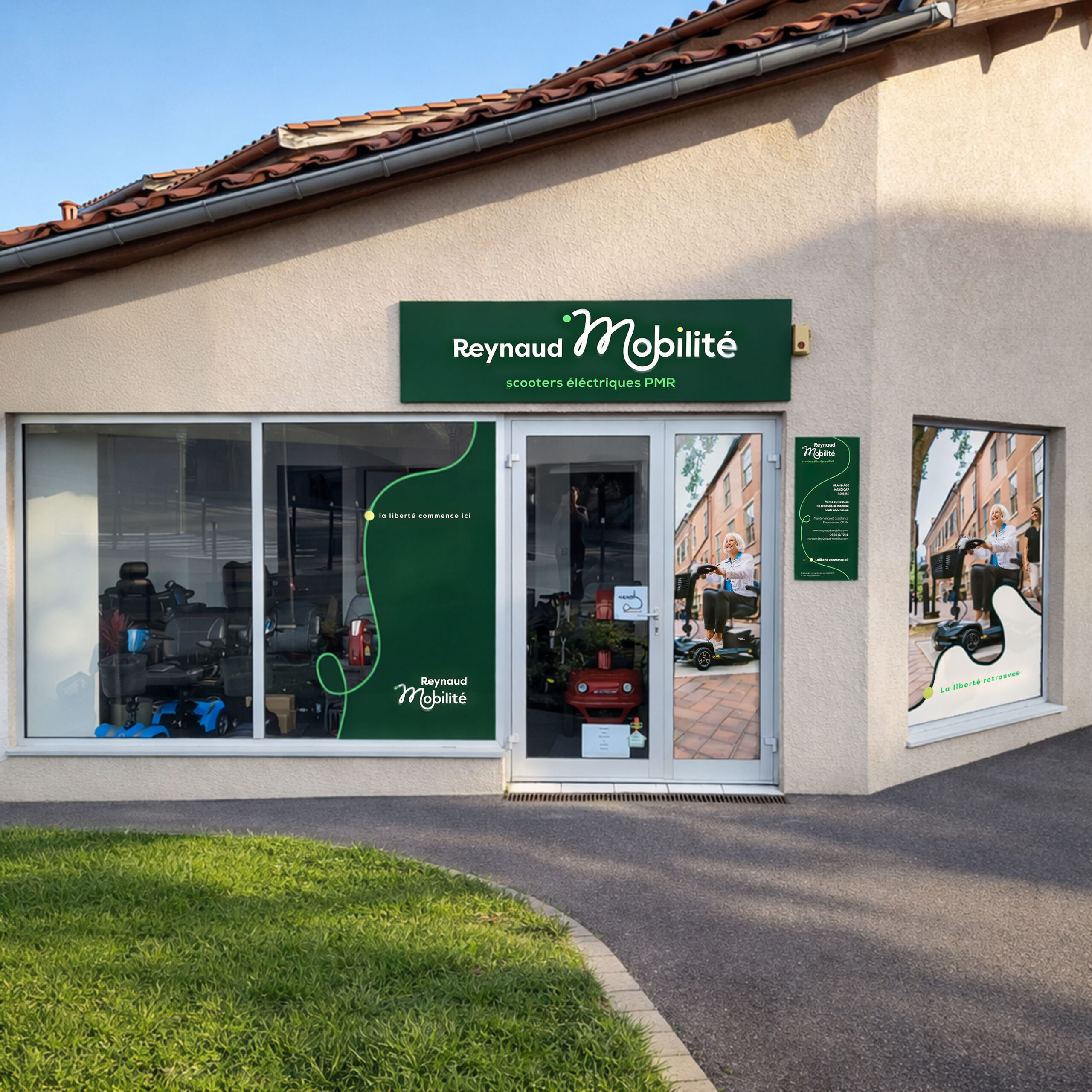 L’identité de Reynaud mobilité se décline sur l’ensemble des supports pour offrir une expérience fluide, humaine et accessible, en magasin comme en ligne.